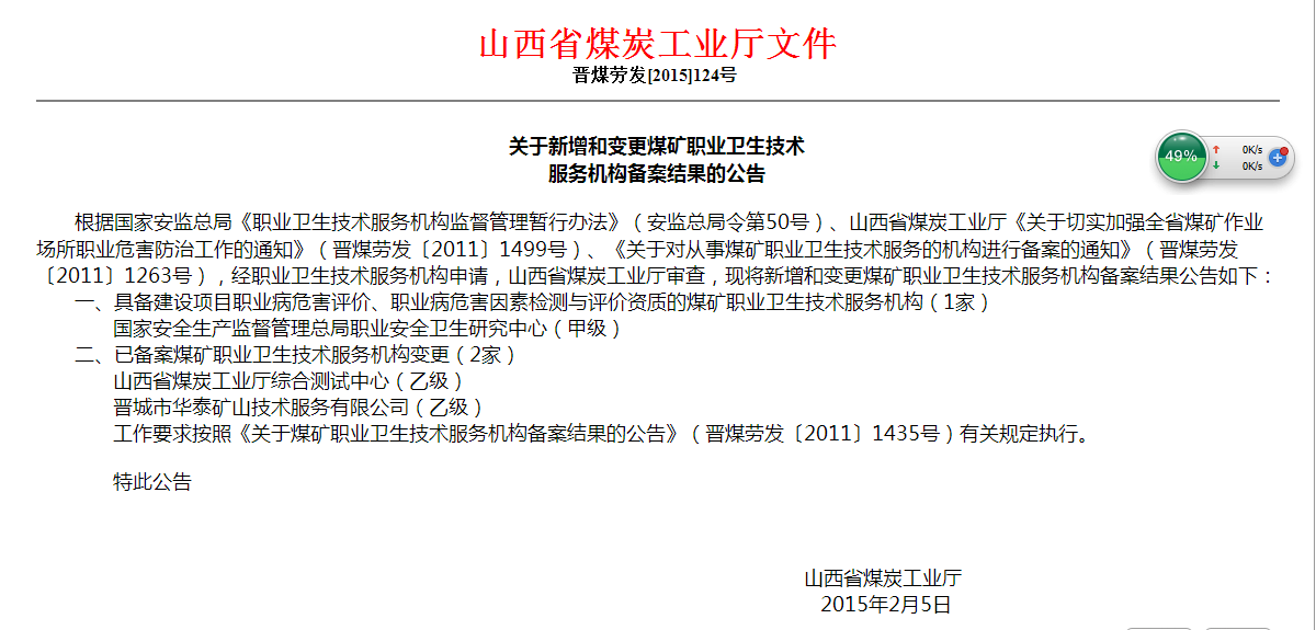 晉城國(guó)投華泰科技有限公司(以下簡(jiǎn)稱華泰公司)是一家經(jīng)營(yíng)性國(guó)有企業(yè),注冊(cè)資金1000.2萬(wàn)元(由晉城市華泰礦山技術(shù)服務(wù)有限公司和晉城澤泰安全技術(shù)服務(wù)有限公司合并整合組建,國(guó)投全資)。公司持有山西省衛(wèi)生健康委員會(huì)頒發(fā)的《職業(yè)衛(wèi)生技術(shù)服務(wù)資質(zhì)證書》、山西省應(yīng)急管理局頒發(fā)的《安全評(píng)價(jià)機(jī)構(gòu)資質(zhì)證書》和山西省市場(chǎng)監(jiān)督管理局頒發(fā)的《檢驗(yàn)檢測(cè)機(jī)構(gòu)資質(zhì)認(rèn)定證書》等資質(zhì),設(shè)施設(shè)備、能力、資質(zhì)配套齊全。...【詳細(xì)信息】